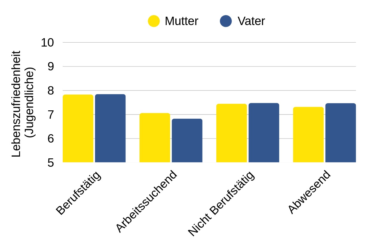 Jugendliche, deren Eltern arbeitslos und -suchend sind, berichten über eine deutlich geringere Lebenszufriedenheit. Die negativen Folgen gehen über die unmittelbare finanzielle Belastung hinaus und wirken sich negativ auf die psychische Gesundheit, die sozialen Beziehungen und die Zukunftschancen der Jugendlichen aus. Dies deutet darauf hin, dass die Jugendlichen ebenfalls unter der finanziellen Not und Belastung der Eltern leiden, und dass die Eltern ihren Kindern weniger Ressourcen zur Verfügung stellen können.