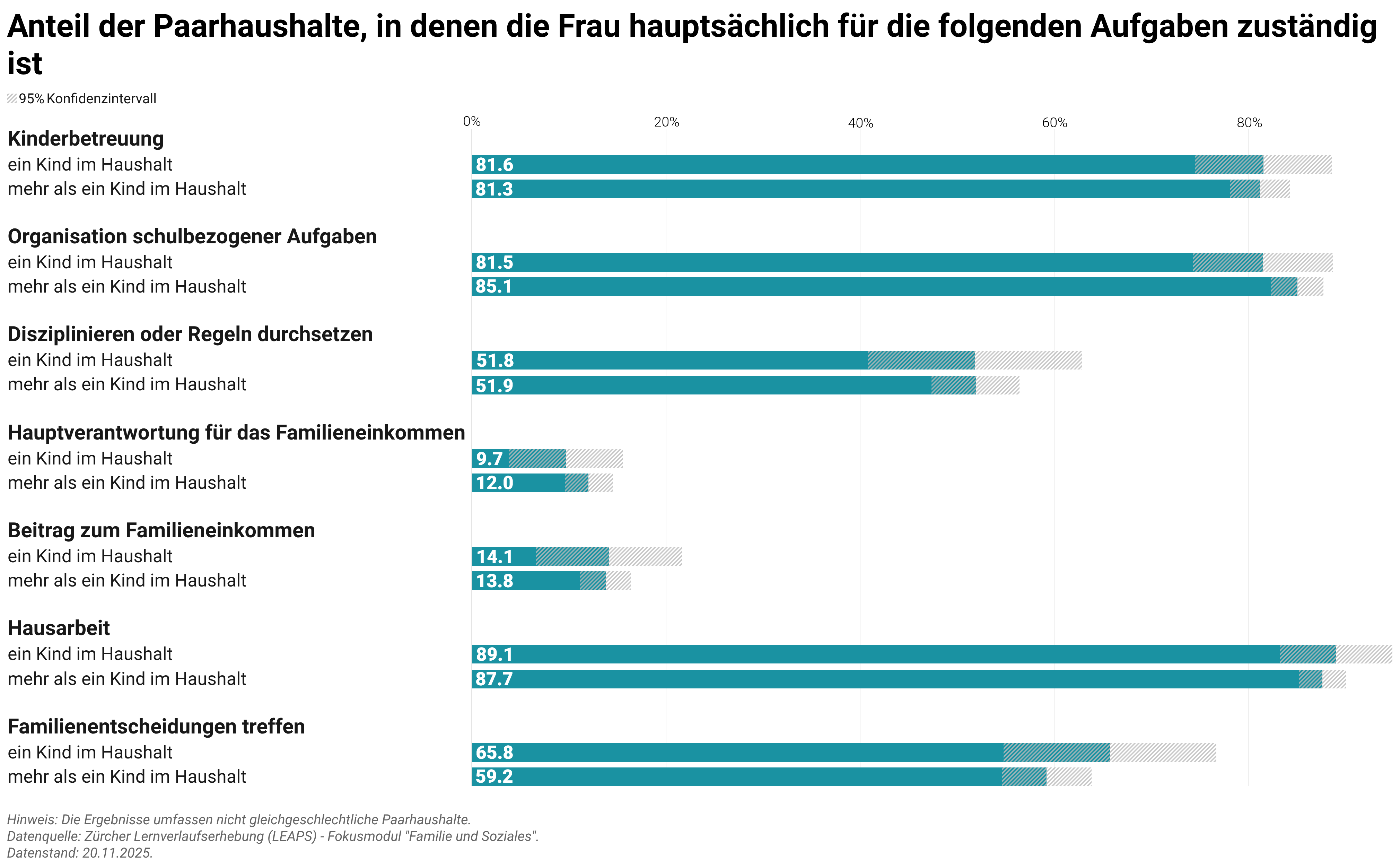Frauen sind deutlich häufiger für Tätigkeiten im Zusammenhang mit der Kinderbetreuung und der Hausarbeit zuständig, und zwar in mehr als 4 von 5 Paarhaushalten. Männer hingegen sind in den meisten Fällen (86% bis 90%) hauptverantwortlich für den finanziellen Unterhalt der Familie. Die Erziehung der Kinder ist ein Bereich, in dem sich beide Elternteile gleichermassen engagieren.