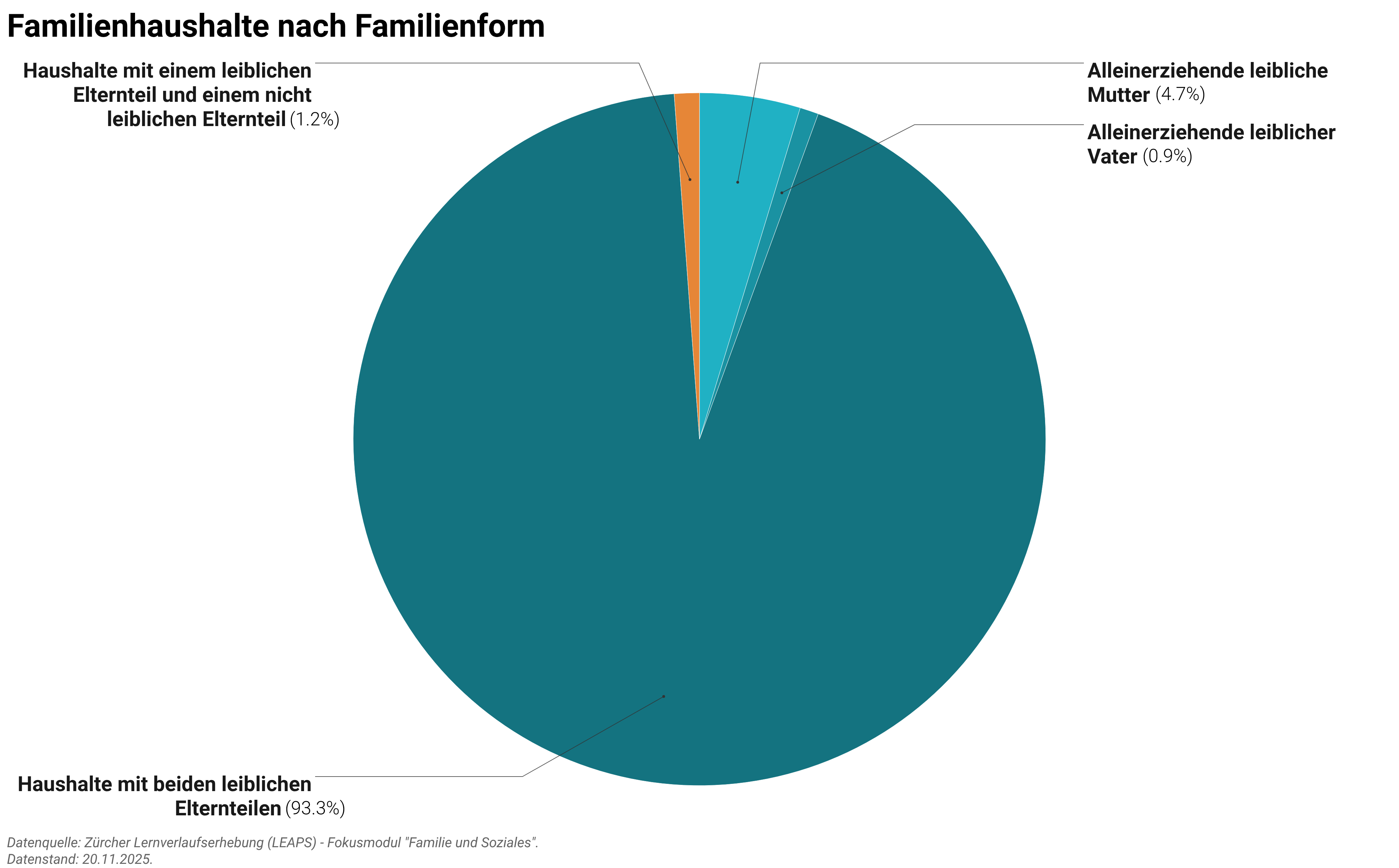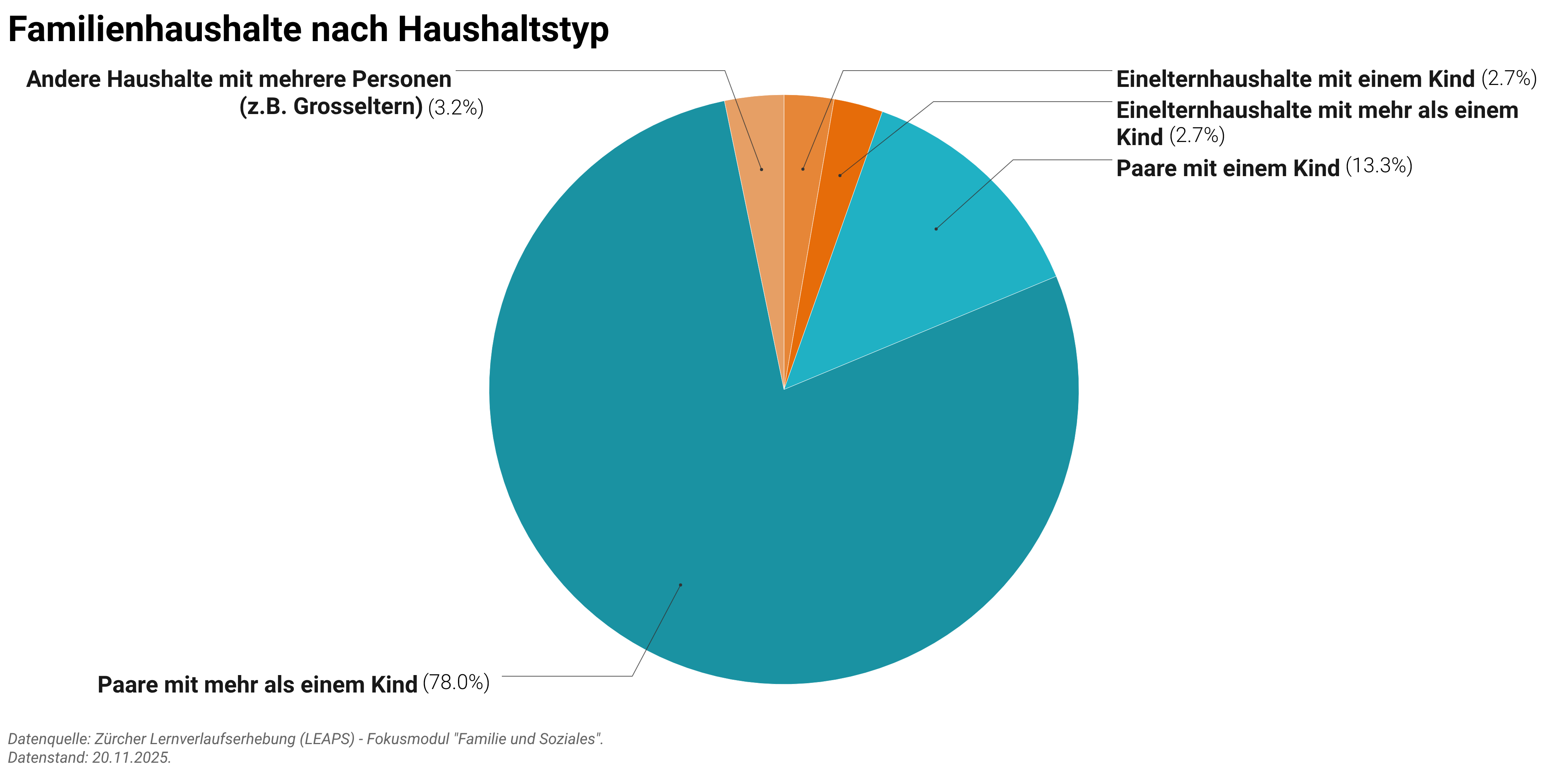 Die ersten Ergebnisse des Fokusmoduls «Familie und Soziales» im Rahmen der Zürcher Lernverlaufserhebung (LEAPS) zeigen, dass über 90% der Haushalte der untersuchten Bevölkerung aus einem Paar mit mindestens einem Kind bestehen, wobei 78% mehr als ein Kind haben. 5,4% sind Einelternhaushalte, in der Regel alleinerziehende Mütter.