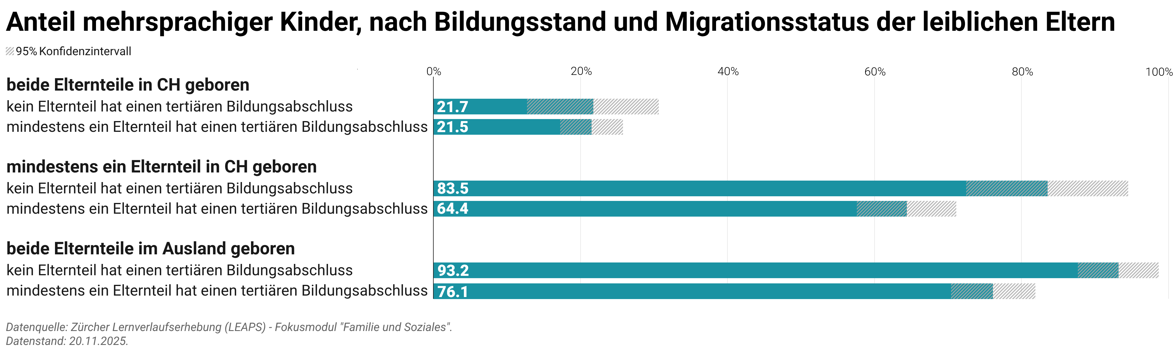 Kinder, bei denen keiner der Elternteile einen tertiären Bildungsabschluss hat, sprechen oder verstehen häufiger eine andere Sprache neben Deutsch, insbesondere in Familien, in denen ein oder beide Elternteile einen Migrationshintergrund haben. In solchen Familien ist der Anteil mehrsprachiger Kinder um 17 bis 19 Prozentpunkte höher, wenn keiner der Elternteile einen tertiären Bildungsabschluss hat, als wenn mindestens ein Elternteil einen Hochschulabschluss hat. In Familien, in denen beide Elternteile in der Schweiz geboren sind, gibt es keine Unterschiede im Anteil der mehrsprachigen Kinder nach Bildungsstand der Eltern.