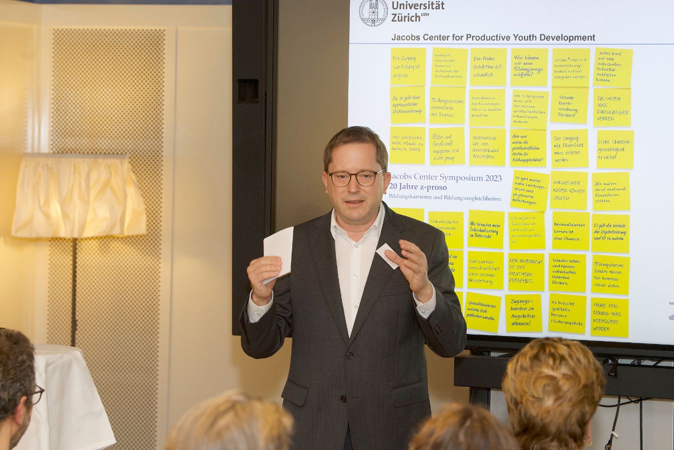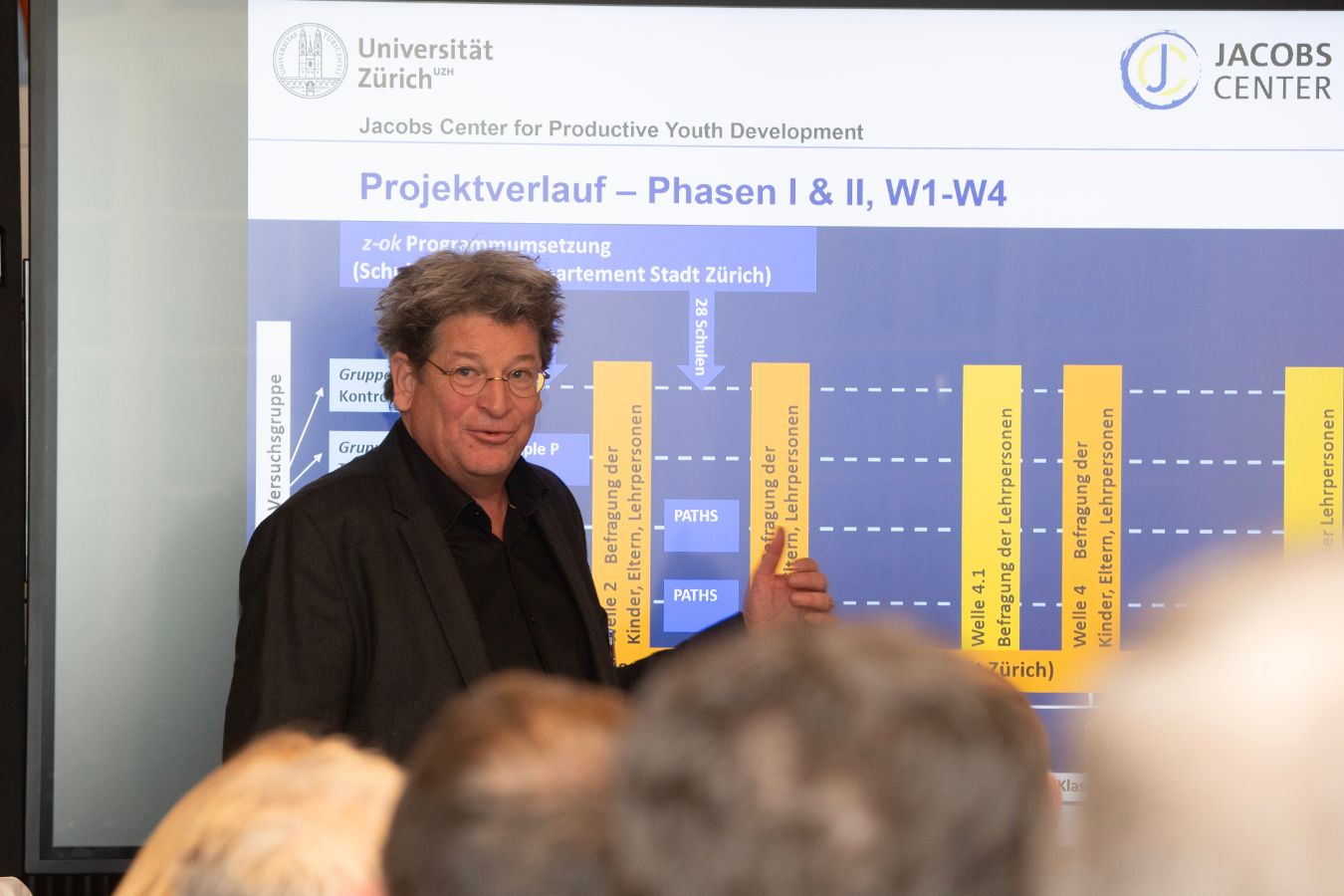 Der Inititant und Co-Projektleiter der Studie, Prof. Dr. Manuel Eisner, blickte auf die Anfänge und die Wirkungen der z-proso-Studie zurück. Co-Leiter Dr. Denis Ribeaud stellte das Design, die Erhebungen und die Partnerprojekte vor und Co-Leiterin Prof. Dr. Lilly Shanahan ging auf ausgewählte Ergebnisse von z-proso zum Bildungsbereich ein. Lea Buzzi analysierte die Bildungswege der z-proso Teilnehmenden. Ausgewiesene Fachpersonen, Entscheidungsträger:innen und weitere Stakeholder im Bereich von Bildung und Erziehung tauschten sich anschliessend mit Forschenden über Wege zur Förderung einer verbesserten Bildungsmobilität aus.